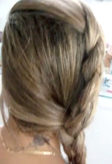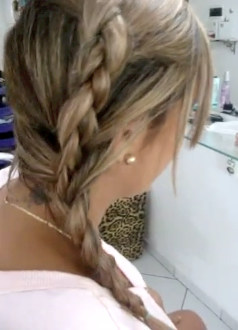 2- Jogue o restante do cabelo, inclusive a trança, para o lado direito e divida-o em 3 mechas, sendo que a trança já feita fica junto com a mecha do meio.